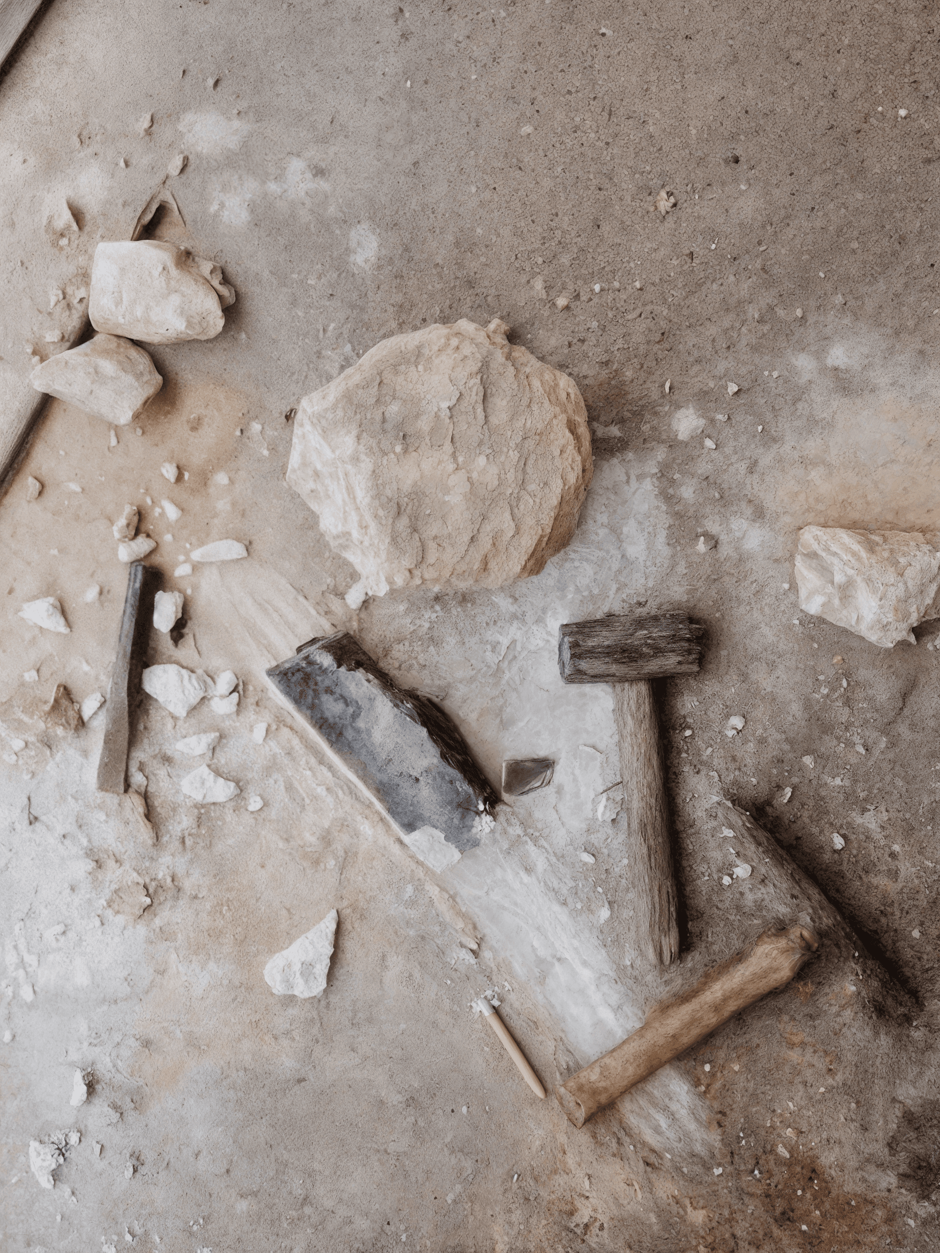 Herramientas de cantería sobre el suelo, fuente desconocida.